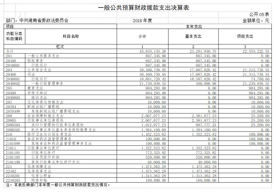 (一)一般公共服务支出:指湖南省委政法委用于开展业务活动所发生的项目支出。行政运行:指湖南省委政法委用于保障机构正常运转的基本支出。一般行政管理事务:指湖南省委政法委机关用于完成相关工作任务发生的项目支出。