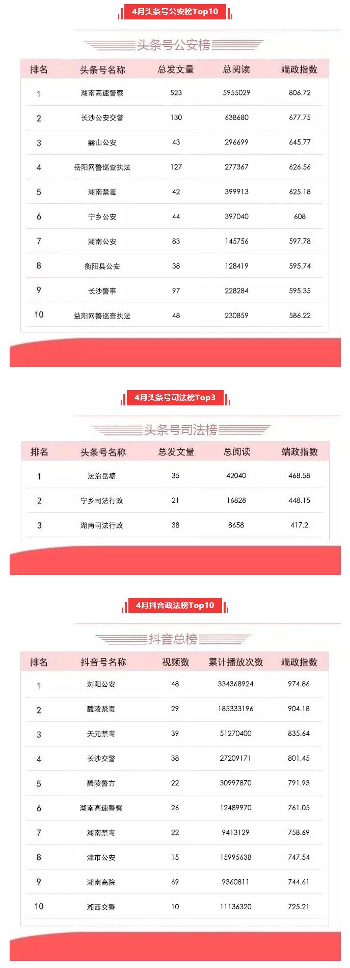 湖南政法系统头条号、抖音号2020年4月榜单
