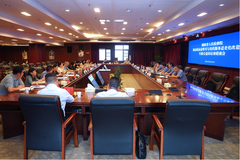 为深入推进药品说明书与用药服务适老化改造,广泛听取各方意见,统一认识、凝聚共识,消除人民群众尤其是老年人和残疾人的用药安全隐患,6月20日下午,湖南省人民检察院组织省药监局、省卫健委、省工信厅、省民政厅、省残联、长沙市市监局等相关部门和药企、药店代表召开公益诉讼案件磋商会,并邀请全国人大代表、省政协委员、省检察院特约检察员、专家咨询委员、人民监督员、“益”心为公志愿者参加。