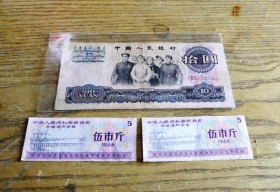 郑国邦珍藏了43年的十元现金与十斤粮票。图/受访者提供